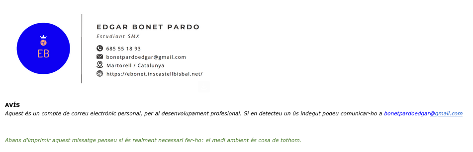 He configurat la meva signatura al correu electrònic professional, la qual afegeix automàticament la informació de contacte i un missatge final als correus. D’aquesta manera, s’estalvia temps i es manté una imatge professional coherent.