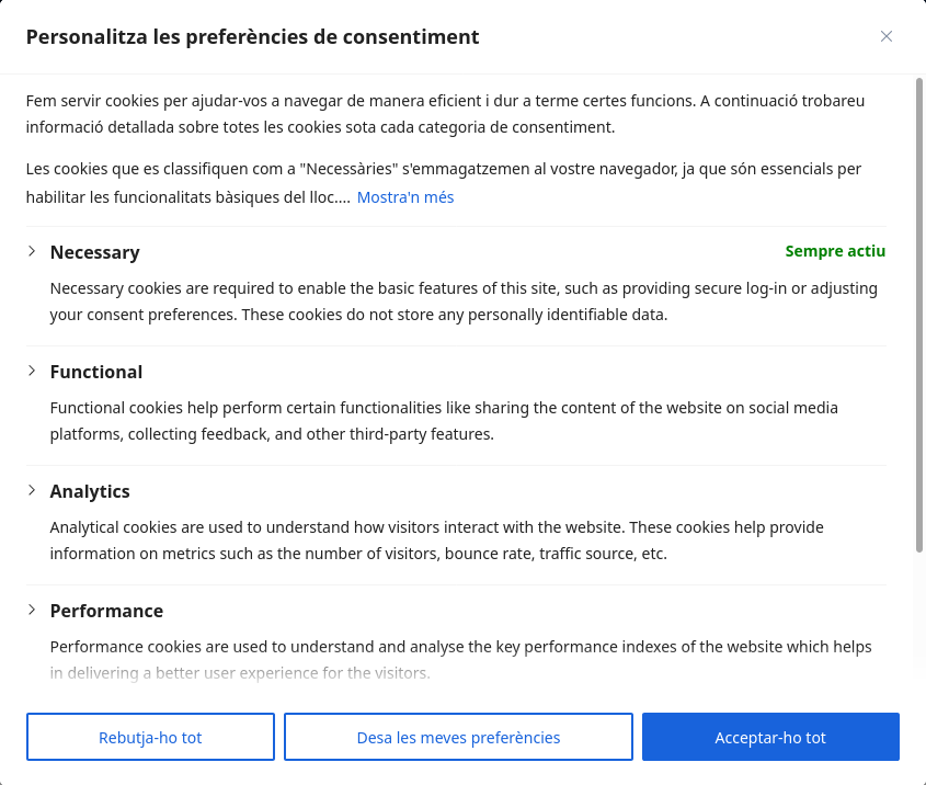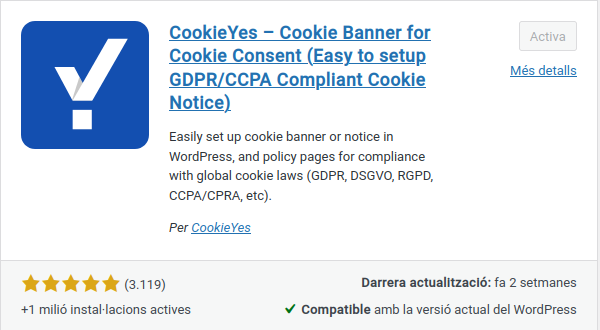 Tota web ha de tenir dues coses obligatòriament, una és l’avís d’un de Cookies i l’altre és la política de privadesa, totes dues informen de quin i quanta informació utilitza la web sobre l’usuari. Per configurar això, podem instal·lar pluguins. Per exemple per les cookies n’hi ha molts, però un dels més coneguts és el “CookieYes | GDPR Cookie Consent” que a l’instal·lar-lo i activar-lo, cada vegada que entrem a la nostra web ens preguntarà sobre les Cookies.