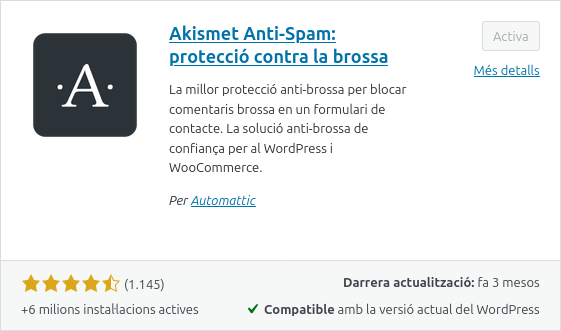 Akismet: Serveix per protegir el blog dels comentaris de brossa, filtrant automàticament els missatges maliciosos o no desitjats. Així, manté la qualitat del contingut i la seguretat del lloc.