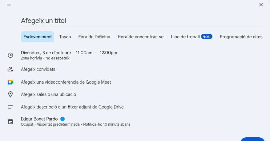 Introdui el títol de l’esdeveniment, la data i les hores d’inici i de fi.