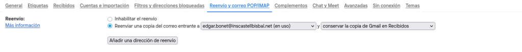 Dins de l’apartat “Reenviament”, cal prémer “Afegeix una adreça de reenviament”.