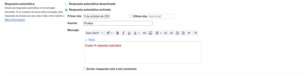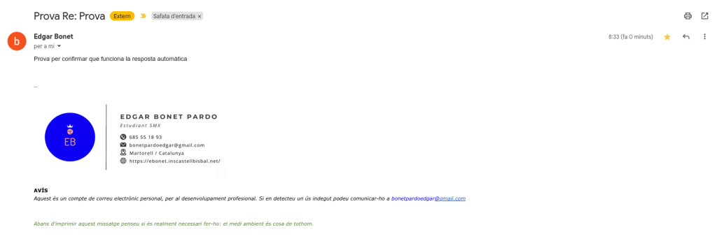 He activat la resposta automàtica, que permet enviar missatges predefinits automàticament quan arriba un correu electrònic.