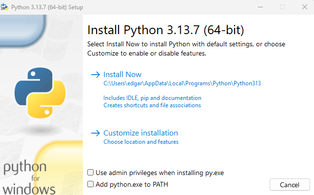 Comprova que tens seleccionada l’opció «Add Python to PATH» abans de prémer «Install Now».