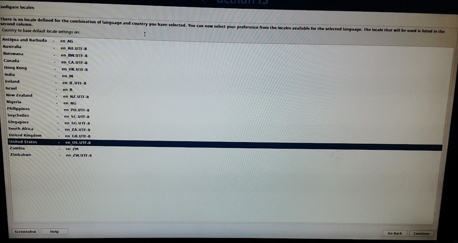 2.4- El següent pas va ser la configuració regional. Encara que abans vam triar Espanya (per a la zona horària), aquí vam seleccionar United States – en_US.UTF-8 per definir el format de caràcters i l’idioma base del sistema.