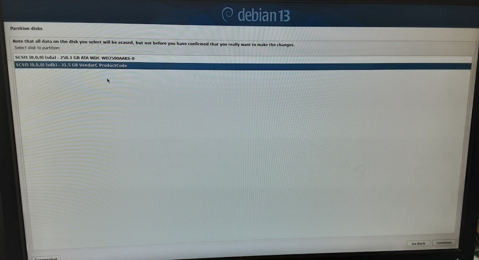 2.8.2- Ara tocava triar el disc. Vam seleccionar l’única opció disponible, el nostre disc de 250 GB: SCSI1 (0,0,0) (sda), perque l’altre hera el USB.