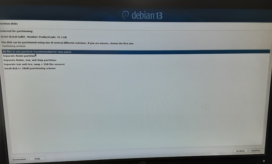 2.8.3- L’instal·lador ens va preguntar com volíem repartir l’espai. Vam seleccionar l’opció que ho separava tot: “separate /home, /var, and /tmp partitions“.