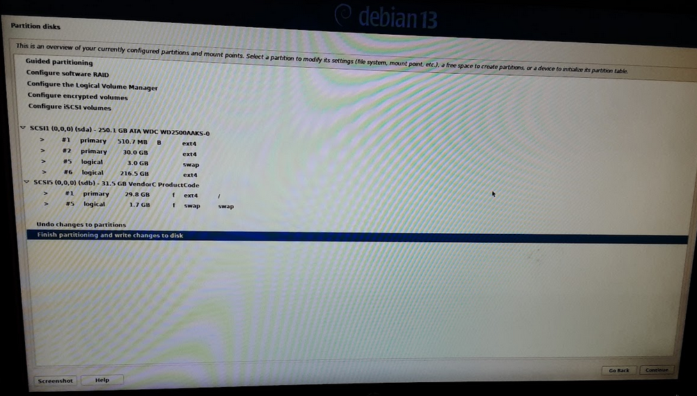 2.8.4- Un cop definit tot l’esquema LVM, l’instal·lador ens va mostrar un resum detallat de tots els canvis que s’aplicarien al disc. Vam revisar que la configuració fos correcta i vam seleccionar l’opció Finish partitioning and write changes to disk.