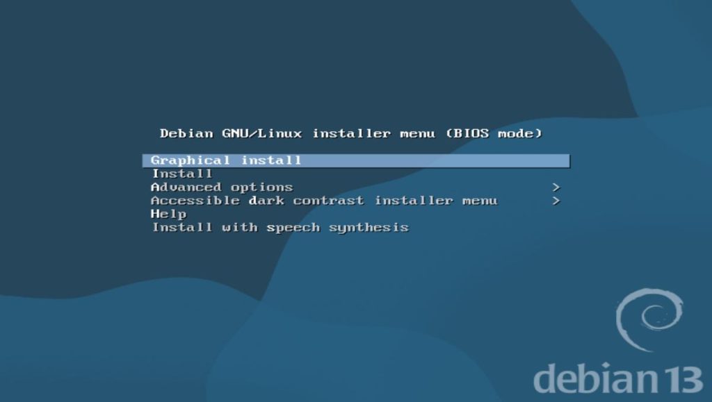 2.1- Vam arrencar l’ordinador amb l’USB connectat. Això va iniciar el menú d’instal·lació de Debian, on vam seleccionar l’opció Graphical Install per començar el procés amb una interfície visual.