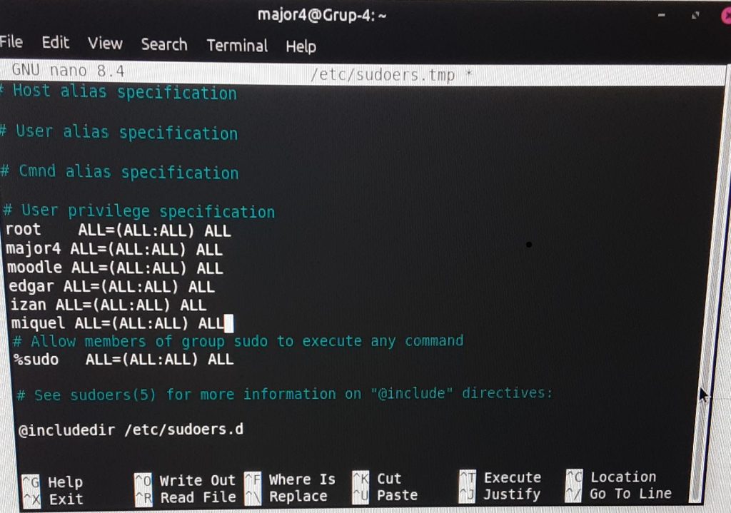 Els usuaris que s’han de donar privilegis son els personals en el nostre cas Izan, Miquel, Edgar i l’usuari major.