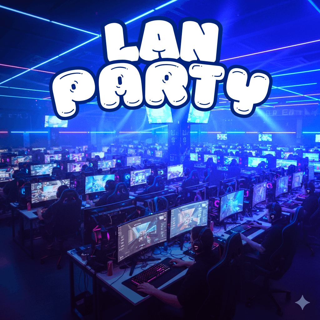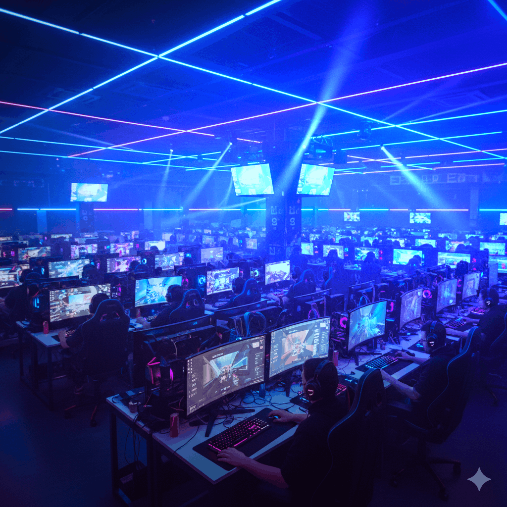 A hyper-realistic 8k resolution cinematic wide shot of a massive LAN Party arena. Thousands of high-end gaming setups with glowing RGB components, mechanical keyboards, and curved monitors. The room is dimly lit, dominated by electric blue and magenta neon lights. Fog and light beams cutting through the air. Professional gamers with headsets focused on screens. Cyberpunk aesthetic, ultra-detailed textures, ray-tracing reflections, shot on 35mm lens, sharp focus, professional color grading.